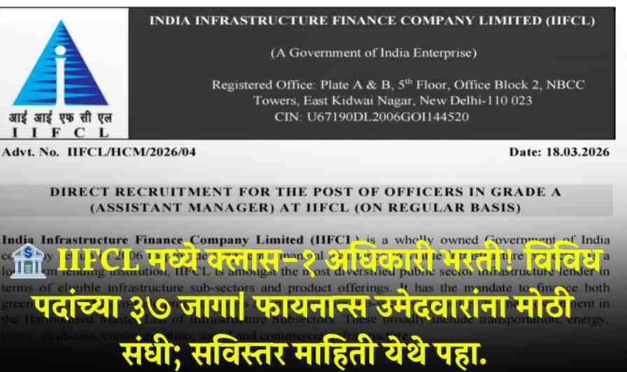IIFCL Recruitment 2026: नमस्कार मित्रांनो, भारत सरकारच्या मालकीची आणि पायाभूत सुविधा प्रकल्पांना दीर्घकालीन अर्थसाहाय्य करणारी महत्त्वाची संस्था ‘इंडिया इन्फ्रास्ट्रक्चर फायनान्स कंपनी लिमिटेड’ (IIFCL) द्वारे २०२६ सालासाठी नवीन भरती जाहीर करण्यात आली आहे. या भरतीद्वारे मॅनेजर (Grade B) आणि असिस्टंट मॅनेजर (Grade A) या अधिकारी श्रेणीतील एकूण ३७ रिक्त जागा भरल्या जाणार आहेत. या भरतीकरीता अर्ज ऑनलाइन … Read more