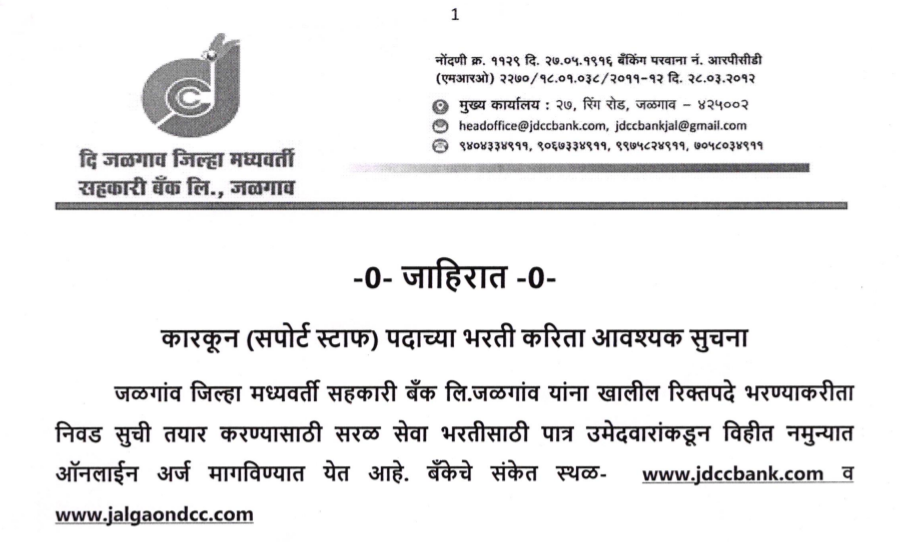 Jalgaon DCC Bank Bharti 2025: рдЬрд│рдЧрд╛рд╡ рдЬрд┐рд▓реНрд╣рд╛ рдордзреНрдпрд╡рд░реНрддреА рд╕рд╣рдХрд╛рд░реА рдмрдБрдХреЗрдд 220 рдЬрд╛рдЧрд╛рдВрд╕рд╛рдареА рднрд░рддреА; рдкрджрд╡реАрдзрд░ рдЙрдореЗрджрд╡рд╛рд░ рдХрд░рд╛ рдЕрд░реНрдЬ